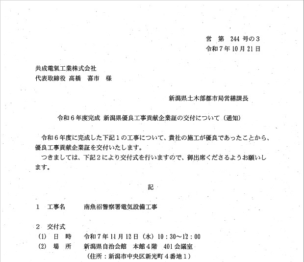 先日、令和6年度完成 新潟県優良工事貢献企業証を新潟県より戴きました。